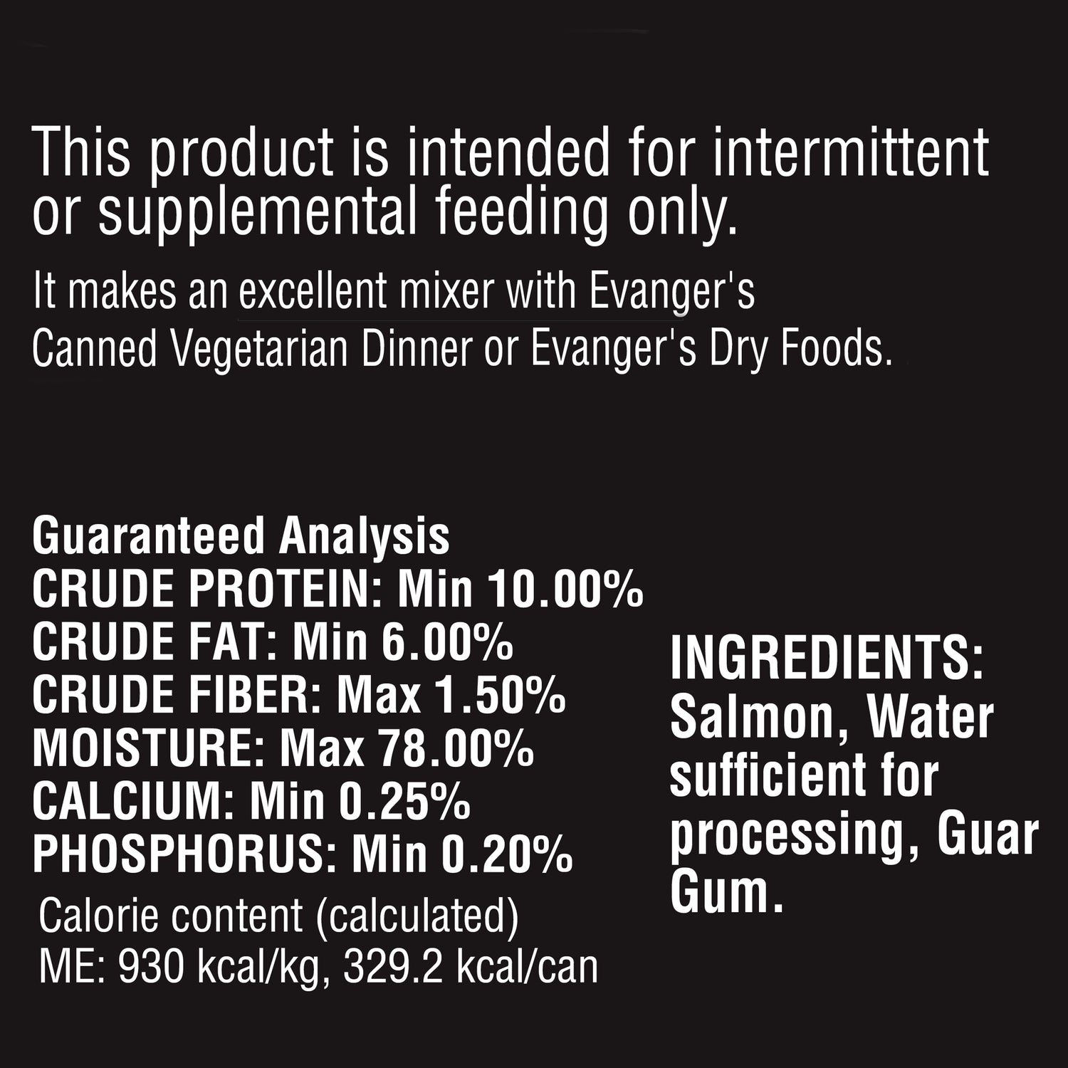 Evanger’s Complements Grain Free Salmon is a simple, single‑protein wet food featuring salmon as the sole meat source, designed as a supplemental entrée, topper, or mixer for dogs and cats. This grain‑free and gluten‑free recipe is ideal for pets with food sensitivities or those on protein‑rotation diets. It can be served alongside your pet’s regular complete food or combined with Evanger’s Vegetarian Dinner to help create a balanced meal. Prepared in pop‑top cans for convenience, this salmon formula adds rich protein and omega fatty acids to your pet’s diet with minimal ingredients and no added fillers.