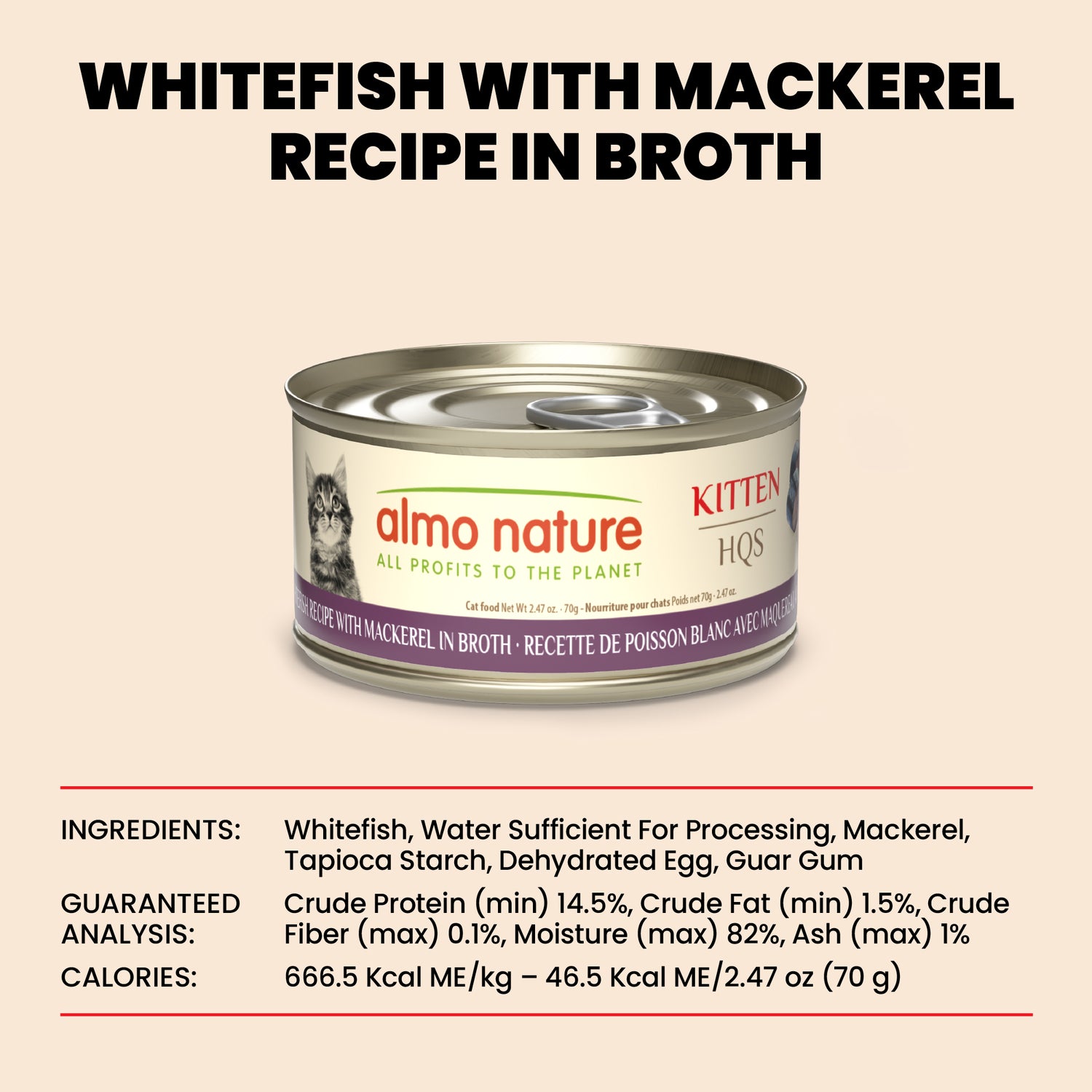 Give your growing kitten a naturally nourishing start with Almo Nature HQS Natural Whitefish with Mackerel in Broth, a gentle, high-moisture wet cat food crafted specifically for kittens aged 0–12 months. Made with HQS (High Quality Sourced) ingredients that were originally fit for human consumption, this limited-ingredient formula combines tender whitefish and flavorful mackerel cooked in a light, hydrating broth — no fillers, artificial colors, flavors, or preservatives included. Every can centers on real fish you can recognize, offering a rich source of digestible protein and essential amino acids to help support healthy growth, energy, and hydration in early life stages.