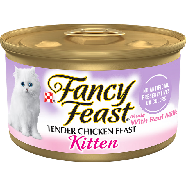 Give your growing kitten a delicious and nutritious start with Purina Fancy Feast Classic Paté Chicken Feast Kitten Wet Cat Food. This smooth, savory paté is crafted with real chicken as a primary ingredient and enriched with real milk and DHA to support healthy growth, brain development, and overall vitality during your kitten’s early life stages. Designed to be 100% complete and balanced according to AAFCO standards, it delivers essential vitamins, minerals, and nutrients for everyday nutrition. With no added artificial colors or preservatives, this kitten formula pairs irresistible flavor with high digestibility — ideal for tiny mouths and developing appetites.