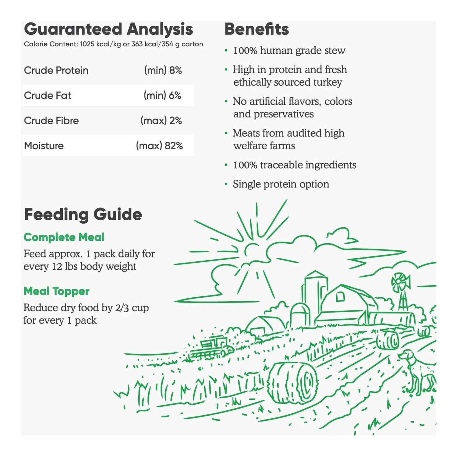 El estofado de pavo Homestead de Open Farm proporciona una dieta equilibrada para su perro con un mínimo de 8 % de proteína cruda, 6 % de grasa cruda, un máximo de 2 % de fibra cruda y un máximo de 82 % de humedad.