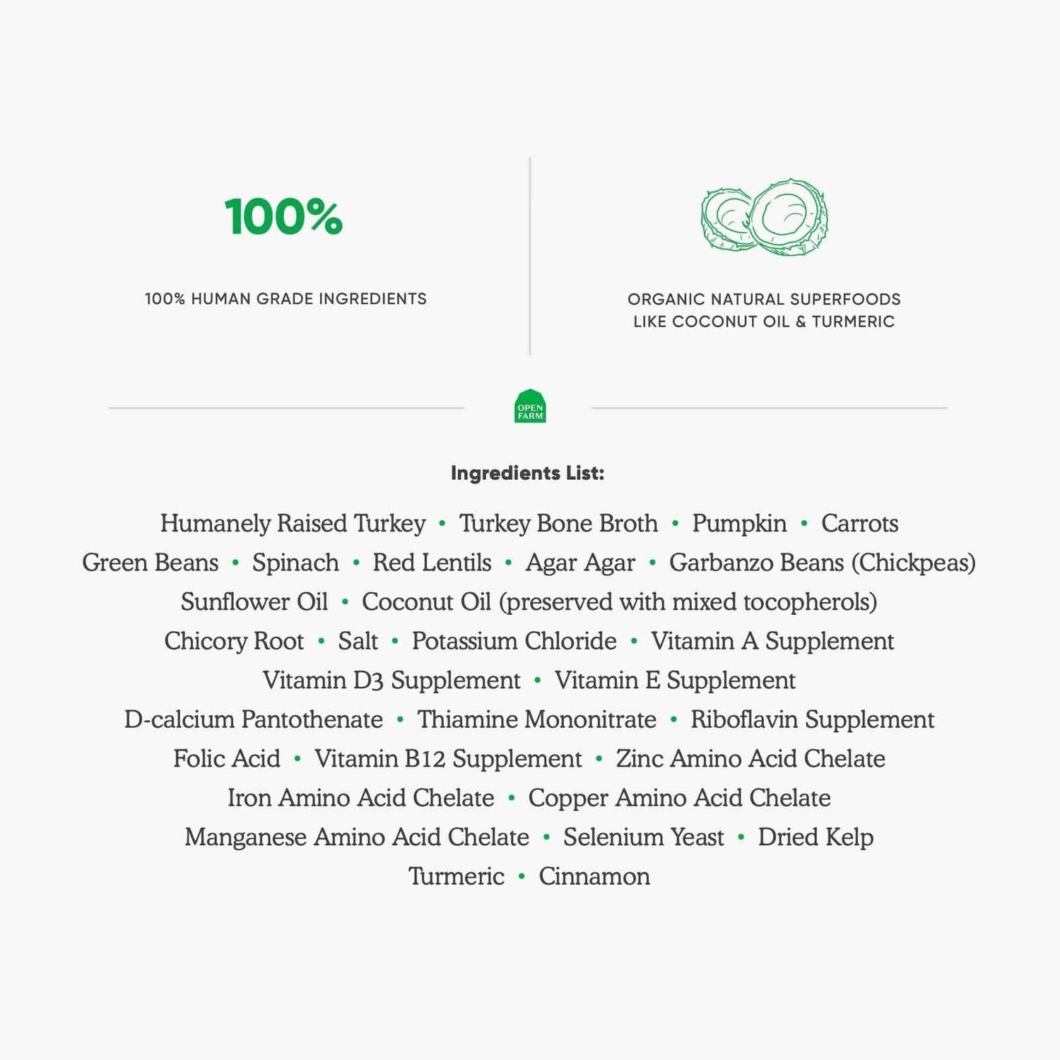 Pavo, caldo de huesos de pavo, calabaza, zanahorias, judías verdes, espinacas, lentejas rojas, agar agar, arándanos rojos sin OGM, garbanzos, raíz de achicoria, aceite de girasol, aceite de coco (conservado con tocoferoles mixtos), sal, suplemento de vitamina A, suplemento de vitamina D3, suplemento de vitamina E, pantotenato de calcio D, mononitrato de tiamina, suplemento de riboflavina, biotina, suplemento de vitamina B12, quelato de aminoácido de zinc, quelato de aminoácido de hierro, quelato de aminoácido de cobre, quelato de aminoácido de manganeso, levadura de selenio.