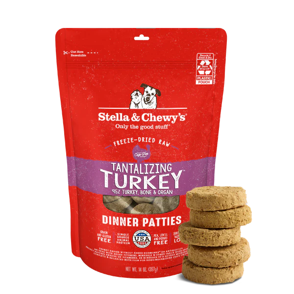 Las hamburguesas de pavo Tantalizing Turkey Dinner Patties de Stella & Chewy son un alimento seco crudo liofilizado para perros, repleto de nutrición y sabor en un práctico tamaño de 5,5 oz. Estas hamburguesas están elaboradas con cuidado, lo que garantiza que su perro obtenga lo mejor en cada bocado.