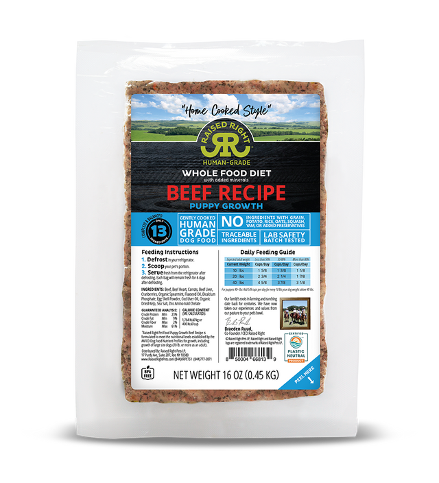 Raised Right Cooked Frozen Puppy Food Beef Growth Recipe 1lb