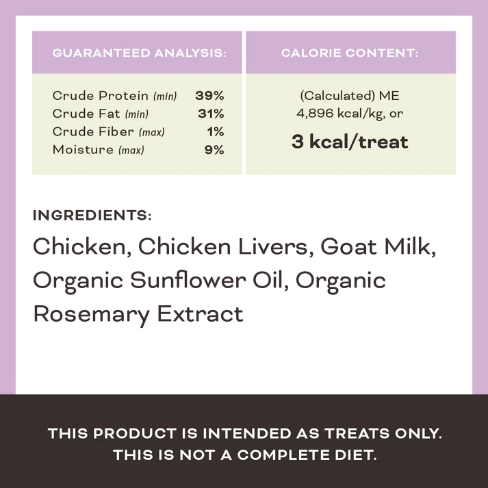Chicken, Chicken Liver, Goat Milk, Organic Sunflower Oil, Organic Rosemary Extract, Liquid Lactobacillus acidophilus fermentation product, Liquid Lactobacillus casei fermentation product, Liquid Lactobacillus reuteri fermentation product, Liquid Bifidobacterium animalis fermentation product.
