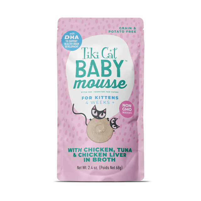 Give your kitten a nutritious and delicious start with Tiki Cat Baby Mousse & Shreds. This complete and balanced wet food combines silky smooth mousse with tender, bite-sized shreds, featuring real chicken as the first ingredient, enriched with tuna and chicken liver. Formulated with DHA for brain and vision development, prebiotics for gentle digestion, and taurine for heart and eye health, it supports healthy growth and a smooth transition from weaning to solid food. Made with non-GMO ingredients and no artificial fillers, it’s a flavorful and wholesome choice for kittens 4 weeks and older.