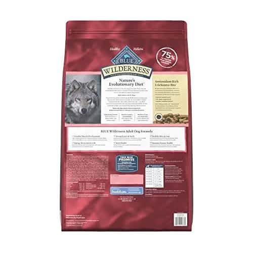 Feed your dog's wild side with Blue Buffalo's BLUE Wilderness High-Protein Salmon Recipe Dry Dog Food. This 24lb bag of dry dog food is packed with real salmon, providing a protein-rich diet that satisfies your dog's natural cravings. Unlike other brands, Blue Buffalo dog food recipes are formulated without any chicken (or poultry) by-product meals, corn, wheat, soy, artificial flavors, and preservatives.