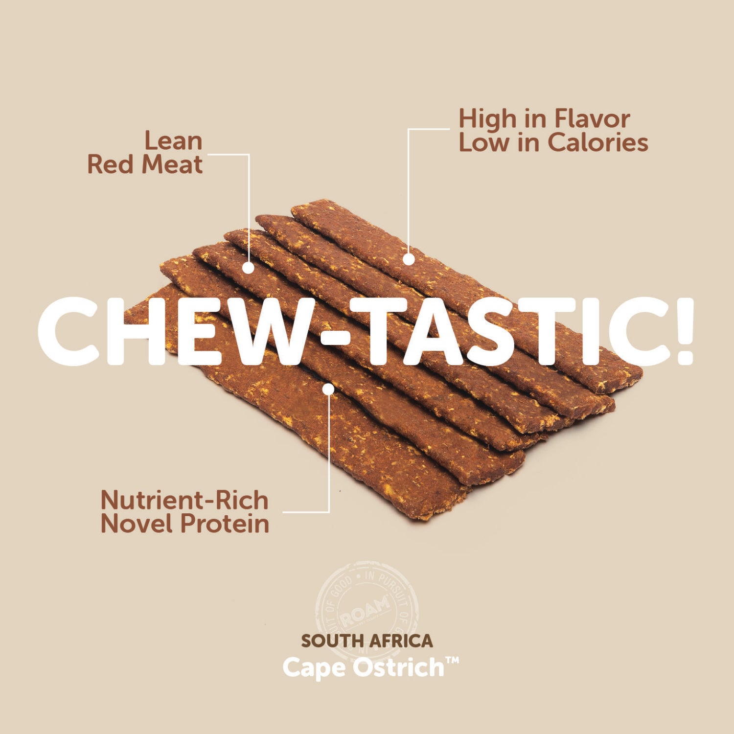 Free-roaming Cape Ostrich Meat, Vegetable Glycerin, Pea Fiber, Vinegar, Molasses, Salt, Spice, Rosemary Extract