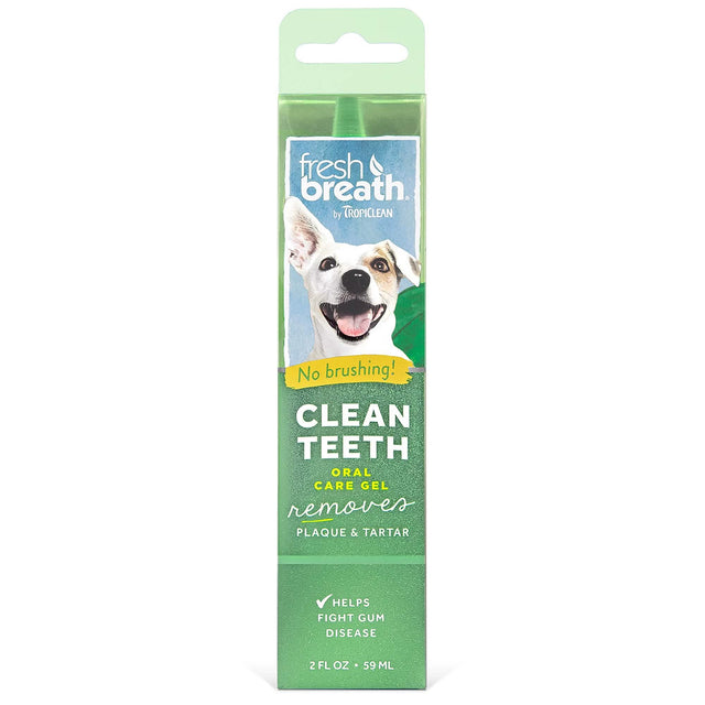 Ensure your dog's oral health with the TropiClean Fresh Breath Oral Care Clean Teeth Gel. This 2oz product from the reputable TropiClean brand is designed to support your dog's oral hygiene without the need for brushing. The delicious mint-flavored gel aids in the safe and effective removal of plaque and tartar, while also freshening your dog's breath. For the best results and maximum protection against bad breath and dental issues, combine this gel with TropiClean Fresh Breath Dental Health Solution and TropiClean Fresh Breath Dental Sticks.
