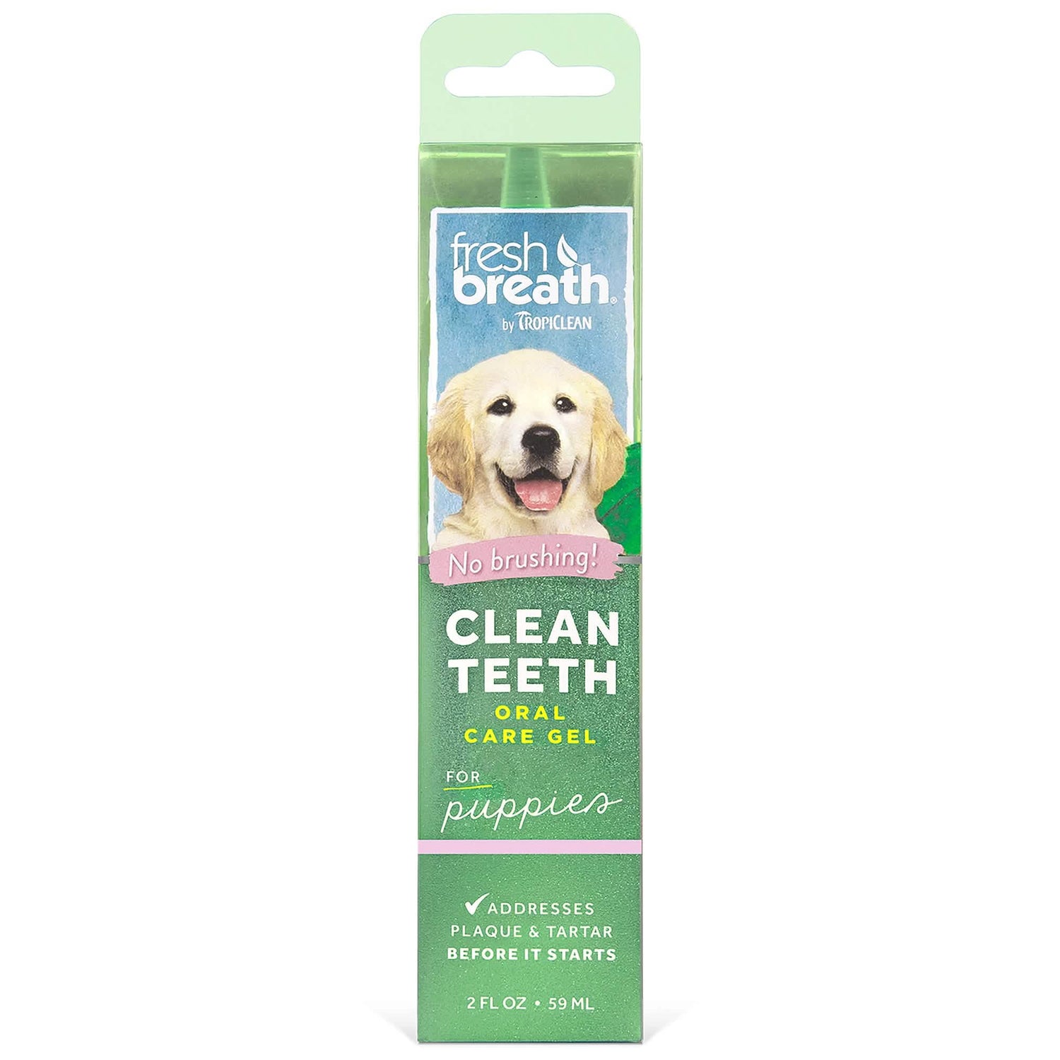 Ensure your puppy's oral health with TropiClean Fresh Breath Oral Care Clean Teeth Gel. Specially formulated for puppies, this mint-flavored gel not only freshens breath but also aids in preventing plaque buildup - all without the need for brushing!