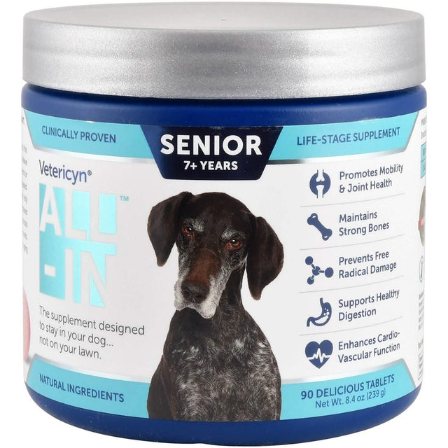 Boost your senior dog's vitality with Vetericyn's ALL-IN SENIOR Supplement. This comprehensive supplement is packed with trusted ingredients like Glucosamine, Chondroitin, Fish Oil (Omega 3), Collagen, Biotin, Calcium and much more! It's designed to support your dog's overall well-being, from bone health to digestive function.
