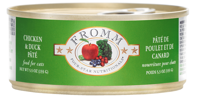 Fromm Four‑Star Chicken & Duck Pâté Wet Cat Food offers cats a moisture‑rich, finely minced blend of real chicken and duck cooked in savory chicken broth. Crafted by the family‑owned Fromm Company with a long tradition of pet nutrition, this wet formula delivers highly digestible animal proteins and balanced nutrition suitable for cats of all breeds and life stages. Its smooth pâté texture makes it especially appealing to finicky eaters and can be served alone or mixed with dry food to add variety to your cat’s meals.