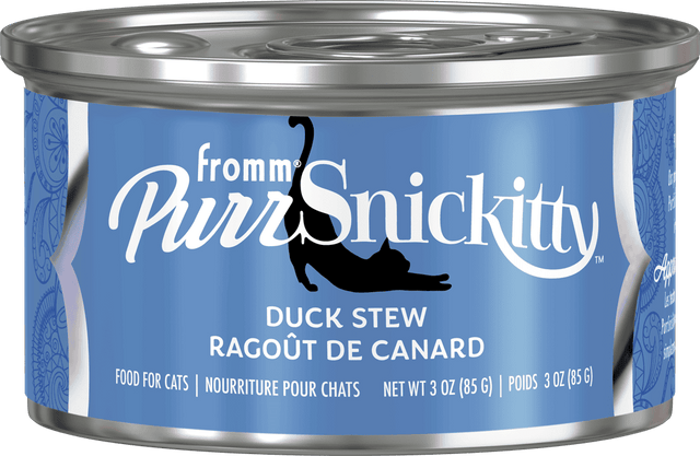 Fromm PurrSnickitty Duck Stew Wet Cat Food is a hearty, moisture-rich recipe featuring tender duck slow cooked in a savory blend of chicken and turkey broth. Carefully crafted by the family-owned Fromm Company in Wisconsin, this complete and balanced entrรฉe delivers high-quality protein and hydration that cats of all breeds and life stagesโfrom kittens to seniorsโcan enjoy. The rich stew texture helps support hydration and palatability, making it a satisfying standalone meal or a flavorful topper to mix into dry food. This formula is designed to meet AAFCO nutrient profiles for all life stages, offering everyday nutrition with quality ingredients.